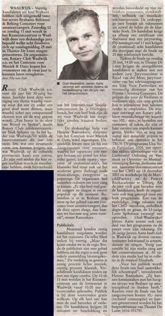 Review among others guestperformance at " Belcanto & Belting Concours "" De Maasroute " 8 May 2003 (Weekly Newspaper)